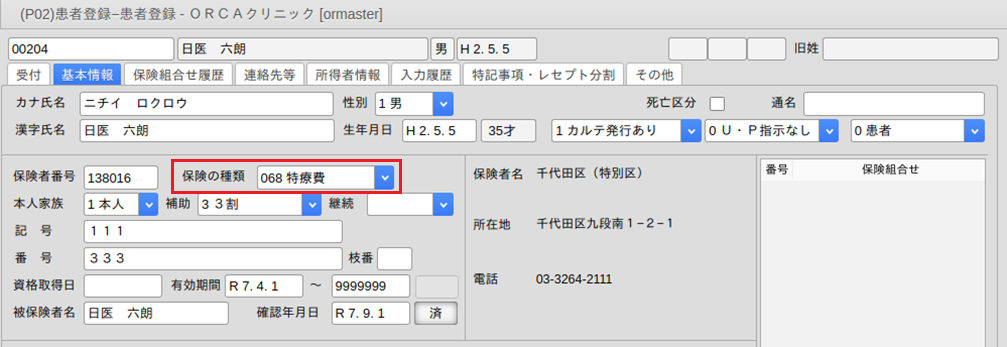 「068 特別療養費」「069 退職特別療養費」「040 後期特療費」を選択すると,患者負担を10割で計算します。補助区分の変更はしません。レセプトの負担割合の記載は次の項目で説明します。