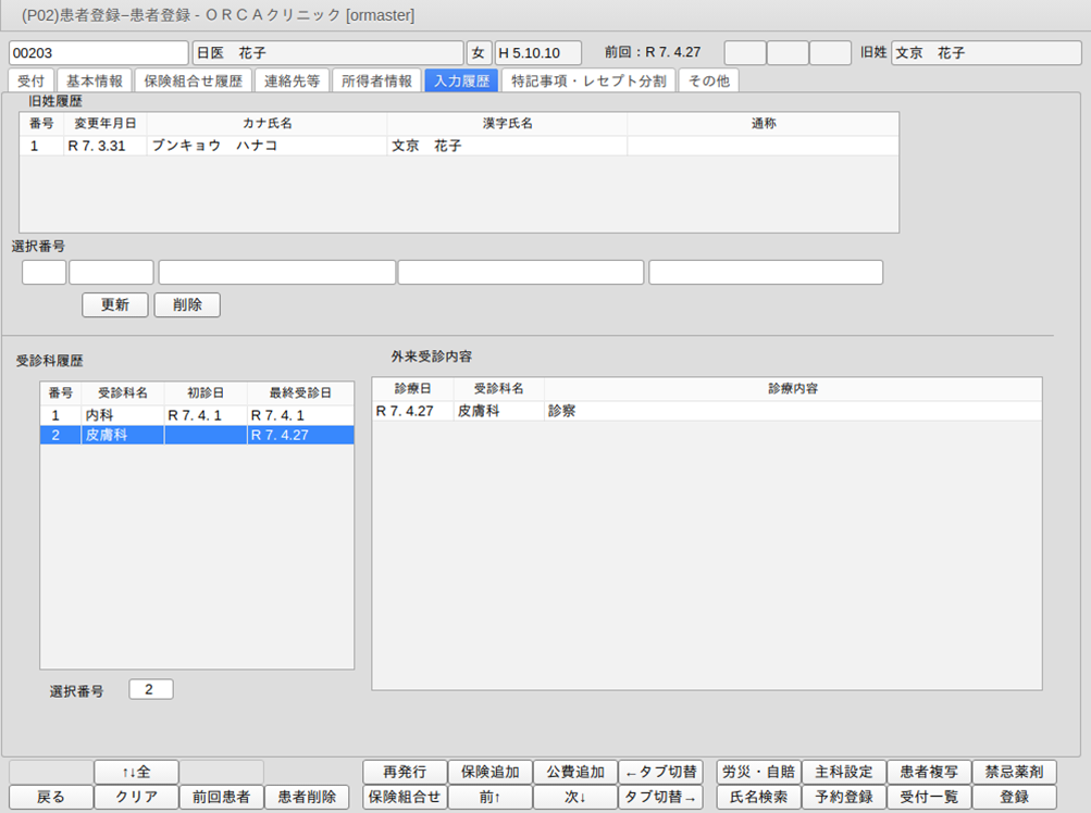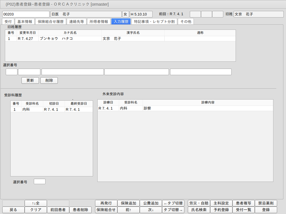 旧姓履歴の更新・削除および受診科履歴の表示をします。