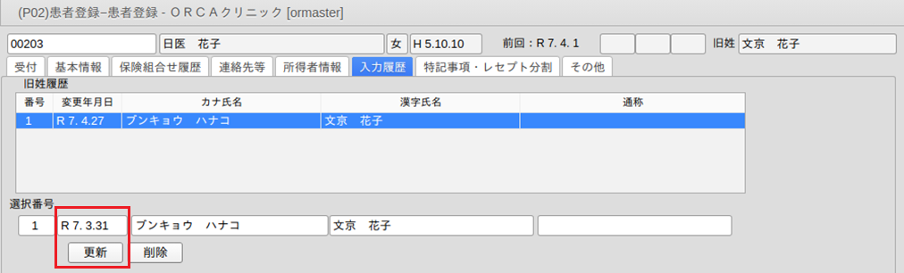 注)旧姓履歴は,旧姓の変更を行った月のレセプト等から変更後の氏名で印刷します。よって,本月以前のレセプトに変更後の氏名で出したい場合は,旧姓履歴一覧から該当の番号を選択し,下の明細行で氏名が変更になった日を変更年月日に入力して「更新」します。