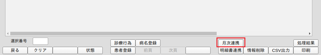 任意の条件で患者検索をします。検索結果画面の「月次連携」(Shift+F9)を押します。
