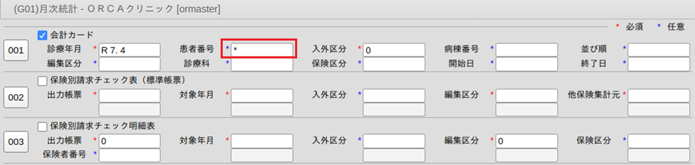 外来月別請求書の患者番号欄に「*」を入力し作成します。