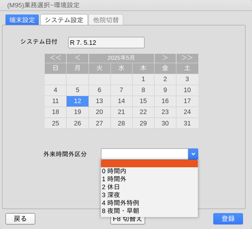 | 環境設定の外来時間外区分に「8 夜間・早朝」を設定している |