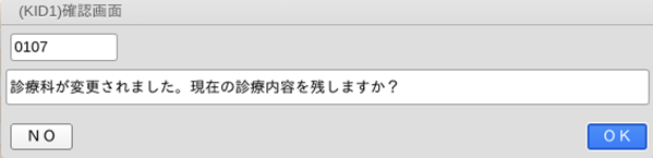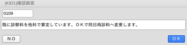 現在入力されている診療内容がある場合,「OK」を押したときは科が変更されても内容を引き継ぎます。「NO」を押したとき,診療内容をクリアします。続いて表示される確認メッセージでは,同日再診料を算定するか否かを指定します。