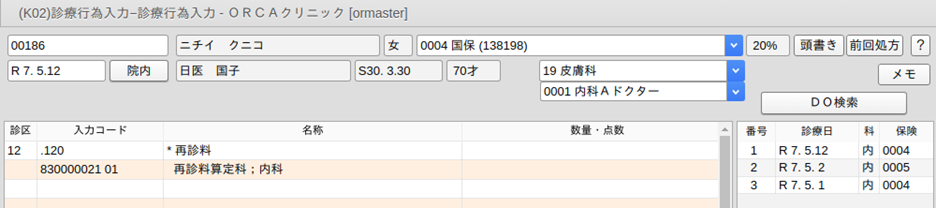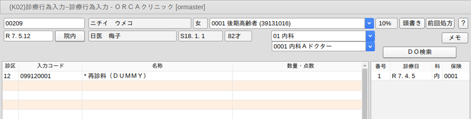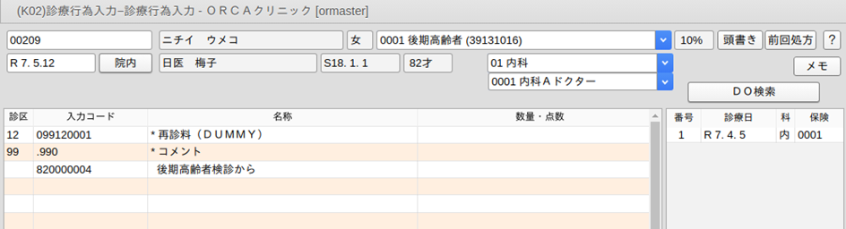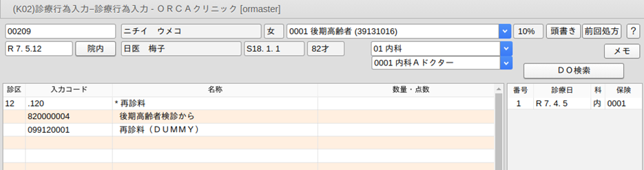 再診料ダミーコード・・・"099120001"
