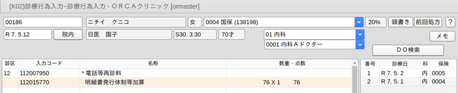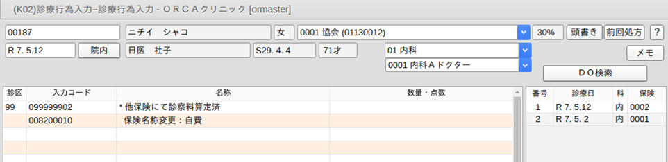 診療行為画面で"099999902 他保険で診察料算定済"の直下にコメントコードを入力します。