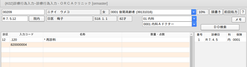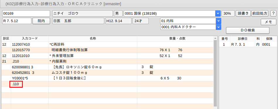 例の場合,再診の診療種別区分「.120」を入力します。次にコメントコードを入力します。
