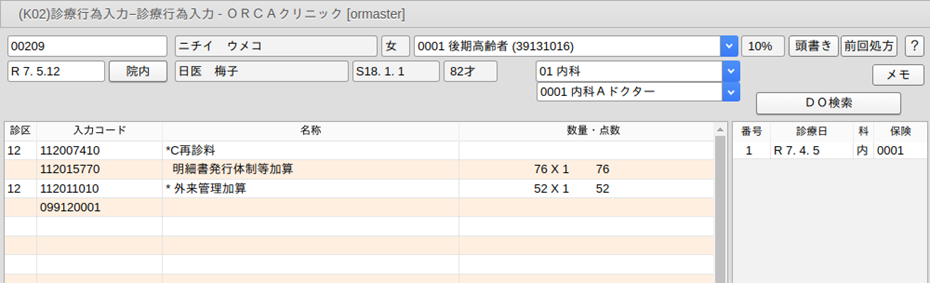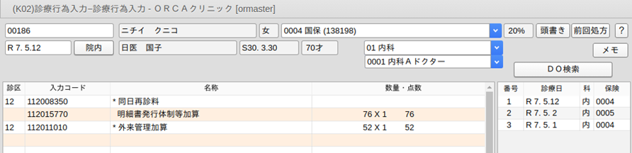 診療行為入力画面に遷移した時点で,再診料と各加算を自動算定します。