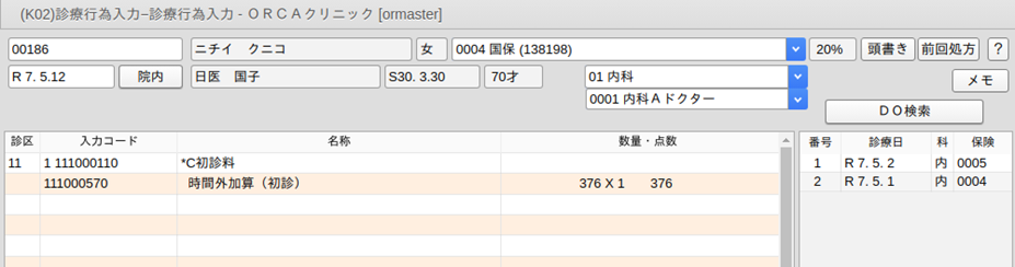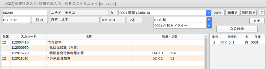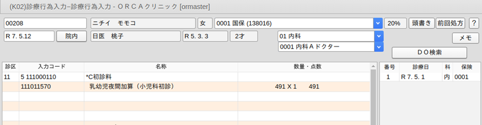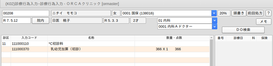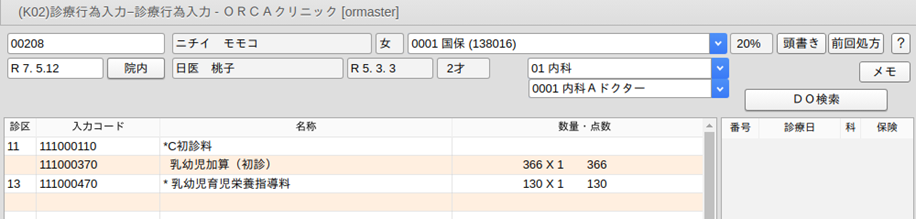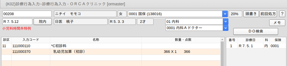 診療行為入力画面に遷移した時点で初診料が算定できる場合は,初診料と乳幼児加算を自動発生します。