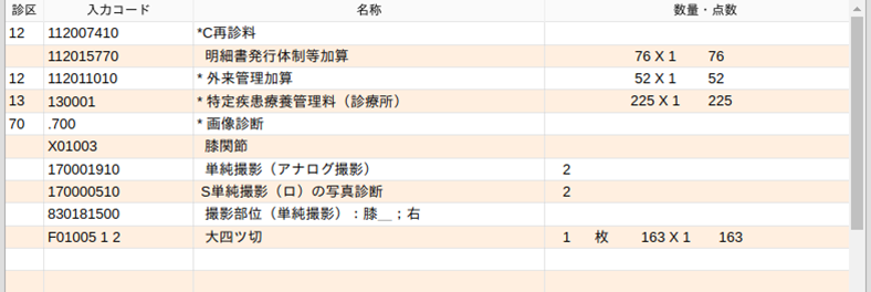 <例3>右膝関節の単純撮影を2方向および写真診断をした場合(膝関節に選択式コメントを登録済み)