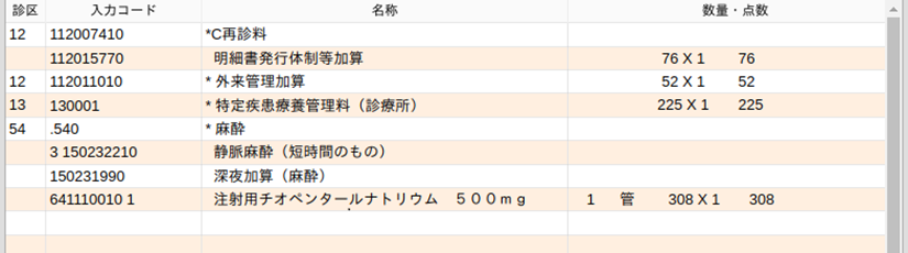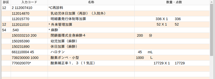 通常は麻酔の「.540」を入力しますが,手技料とは別に処置薬剤のみや処置材料のみ入力するときに表のような