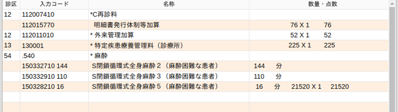 また,環境設定(F6)で時間外区分の設定が済みの場合は,診察料と時間外加算等が算定できる診療行為コード(この場合は静脈麻酔)に時間外加算等を自動発生します。