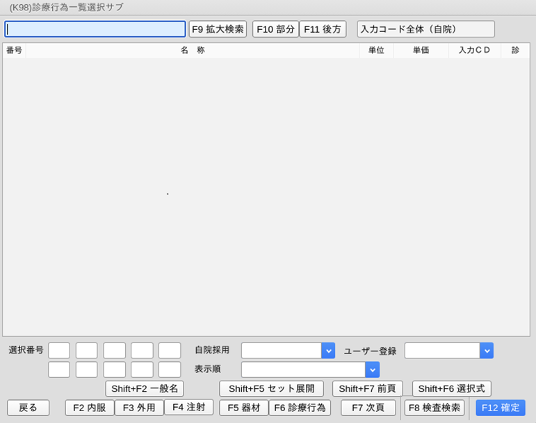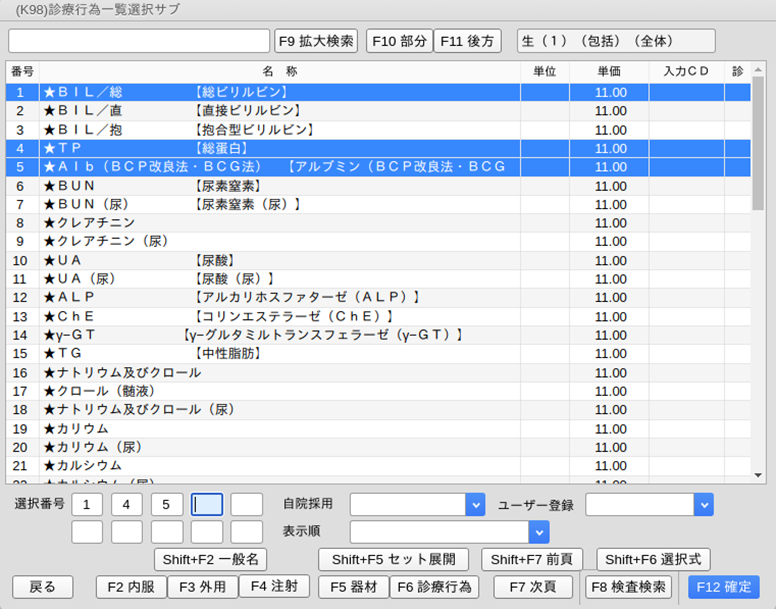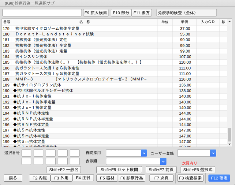 初めに一覧に表示するのは,指定した検査区分の中で入力コード(入力CD)の登録がある検査になります。入力コードの登録に関わらず対象区分の検査項目をすべて一覧表示するには,「F9 拡大検索」を押します。