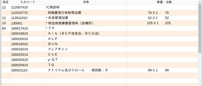 (入力例ではいずれの検査にも入力コードが登録されているため,診療行為入力画面は入力コードを表示します)。