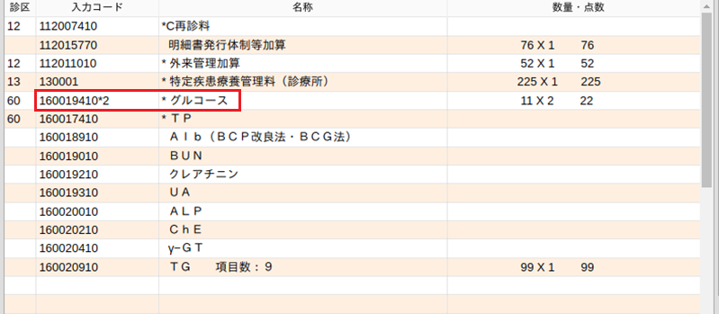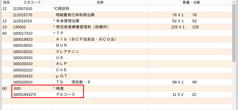 診療種別区分「.600」を入力し,他の検査とは剤を別にしてグルコース2回を入力します。