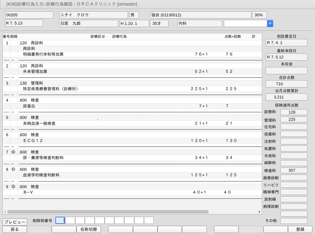 「登録」(F12)を押して遷移する診療行為確認画面で,自動算定された剤を確認できます。削除列に「◎」が表示してある剤が自動算定項目になります。