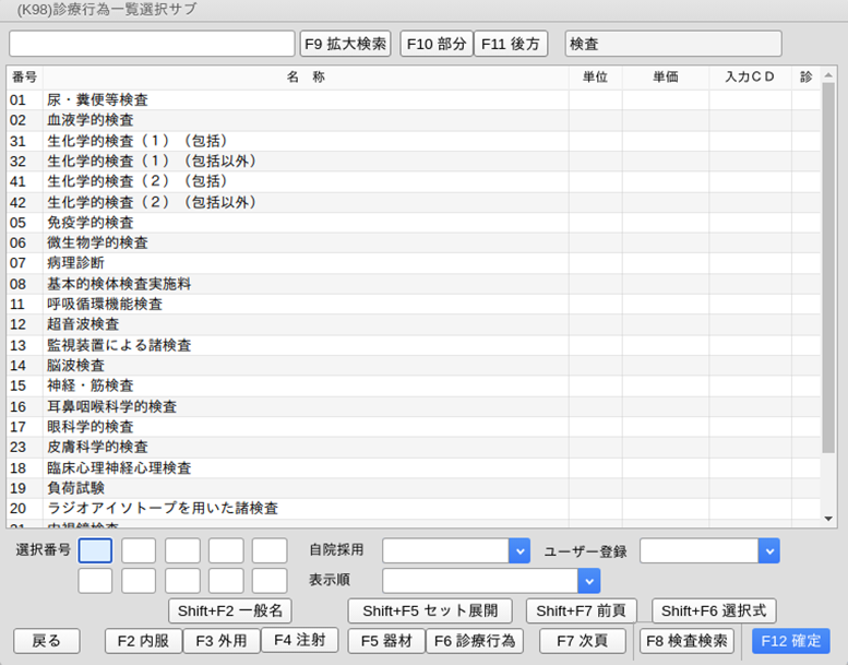 「F8検査検索」を押すと検査の区分名の一覧を表示します。