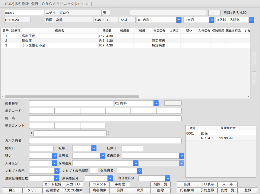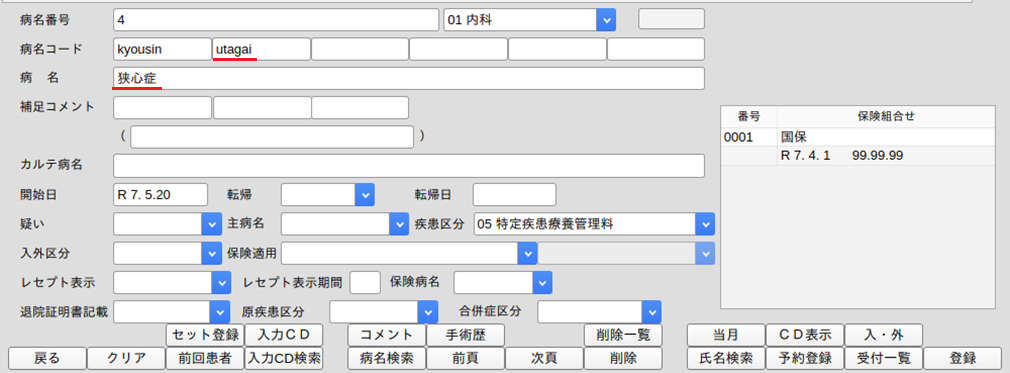 病名コード~保険病名の各項目を入力します。病名コード欄にコードを入力する場合は同じ開始日の病名を複数