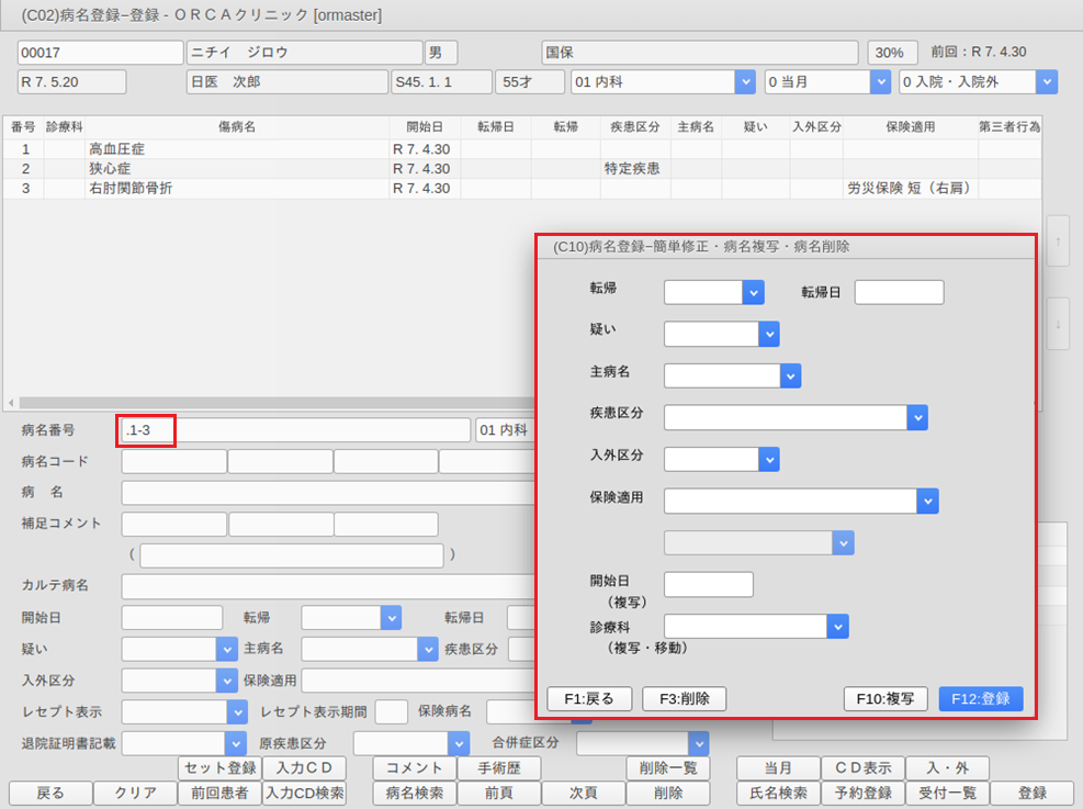 | 登録 | F12 | 画面内の編集された患者病名をマスタに登録します。 |