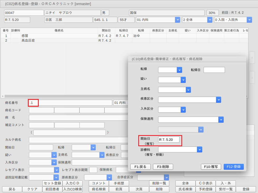 入力出来ます。入力後,「登録」(F12)を押すと患者病名マスタに登録します。