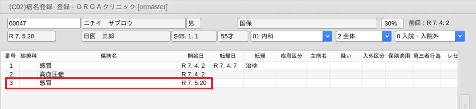 開始日は,入力しない状態で「登録」すると患者番号欄下の診療年月日の日付で登録をします。
