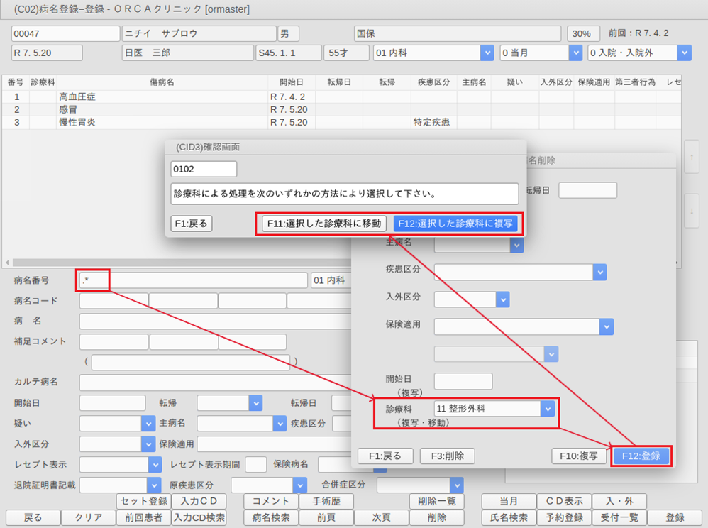 複写(移動)先の診療科をセットし,「登録」(F12)を押します。
