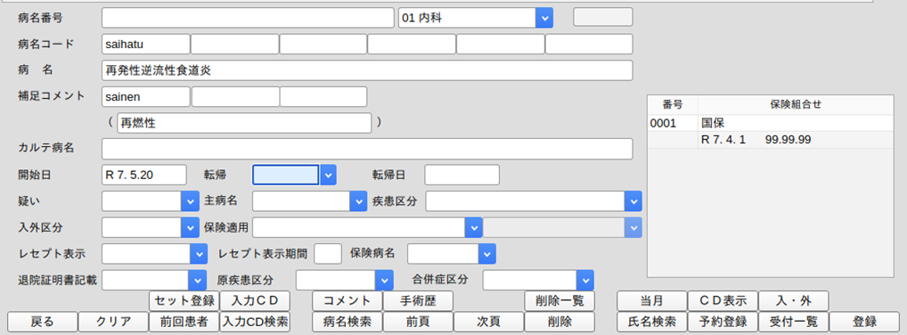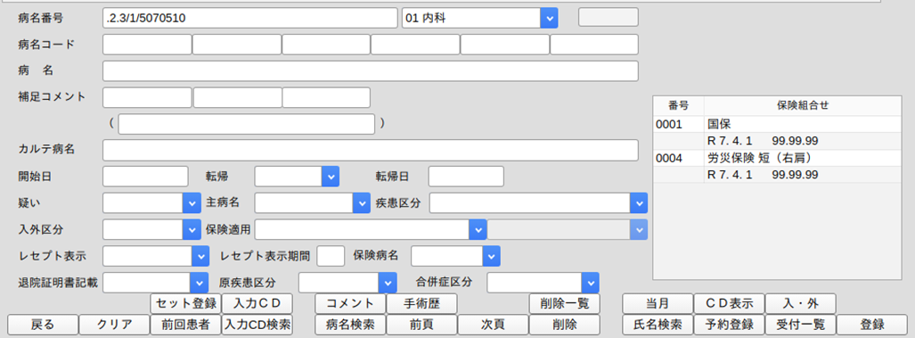 | CD表示 | Shift+F10 | 入力されたコードを表示します。 または直接病名に入力された文字列が病名マスタと一致した場合コードを表示します。 一致しない場合は「0000999」を表示します。複数病名が入力済みの場合は空白行をあけて,区切って表示します。 |