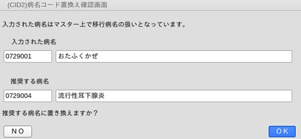 移行先の病名に置き換える場合は「OK」を,置き換えずに入力した病名とする場合は「NO」を選択します。