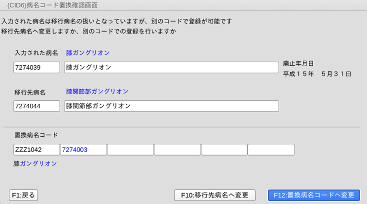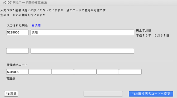 置換病名を採用する場合は「置換病名コードへ変更」(F12)を押します。