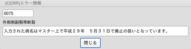 病名マスタに移行先コードがなくて廃止年月日がある場合(99999999以外),廃止病名であることをエラーメッセージで表示します。