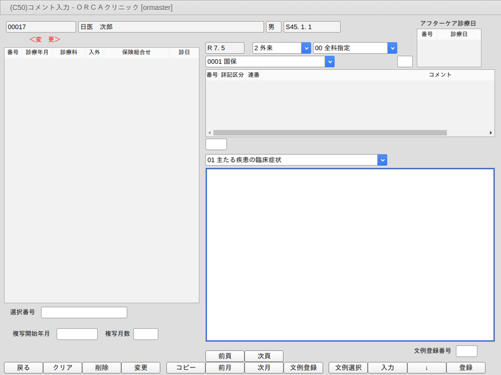 | 補足コメント | 入力CDまたは傷病名コードを入力すると補足コメント欄に表示します。 直接ワープロ入力できます。 | ||||||||||||||||