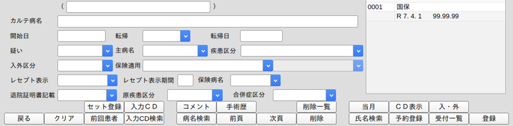 | 入力CD検索 | F4 | 自院で編集した病名の登録をします。 |