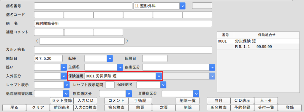 ただし,各レセプトへ病名を印字させるためには「保険適用」欄へ労災保険または自賠責保険,公害を選択することが必須になります。