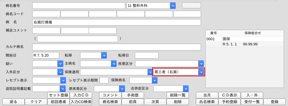 • 「第三者」が選択されている病名は,医保のレセプトと自賠責(第三者行為)レセプトの両方に記載します。