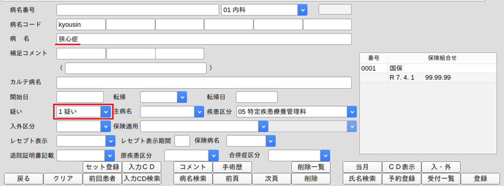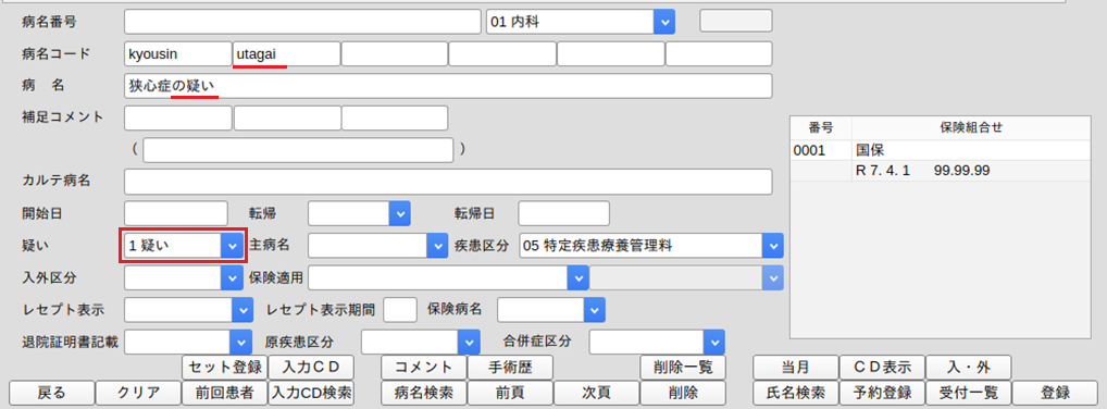 病名コード欄に疑いコードを入力すると疑い区分を自動算定します。