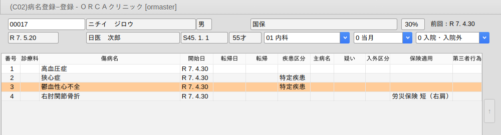 「.(病名番号)/転帰/転帰日/疑い/主病名/疾患区分/入外区分/保険適用」