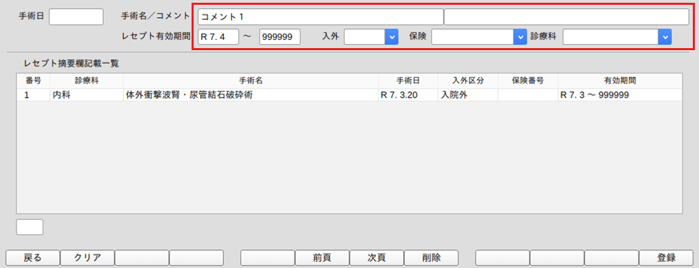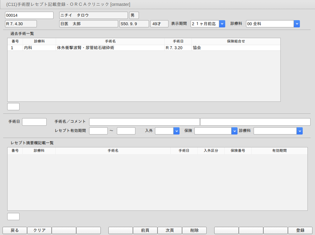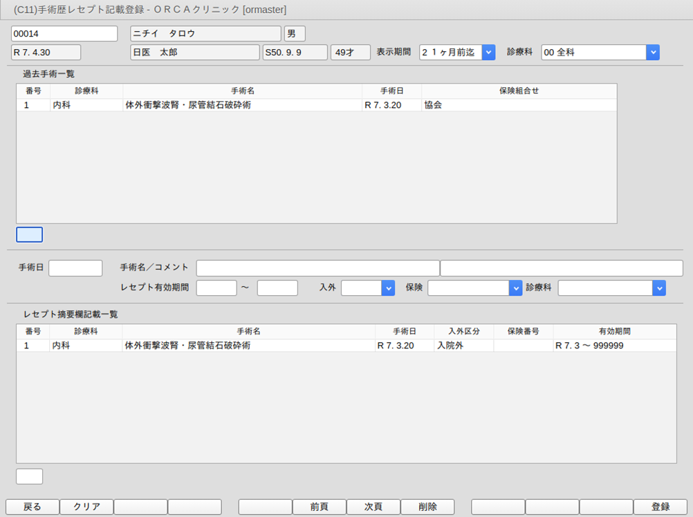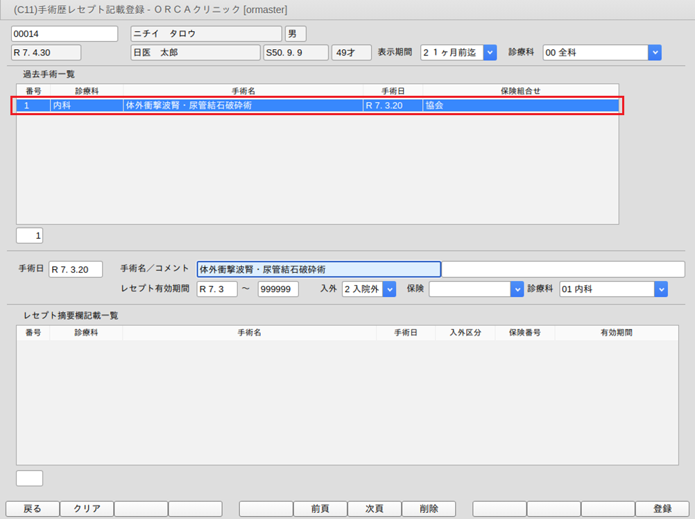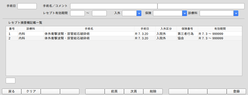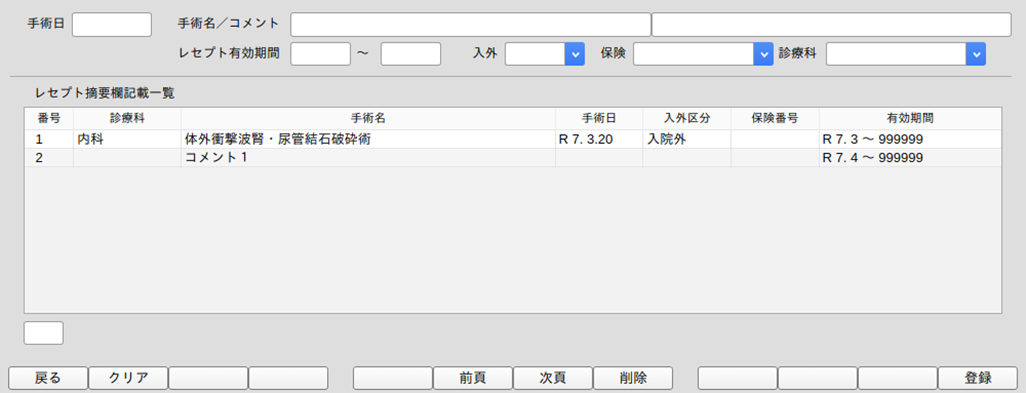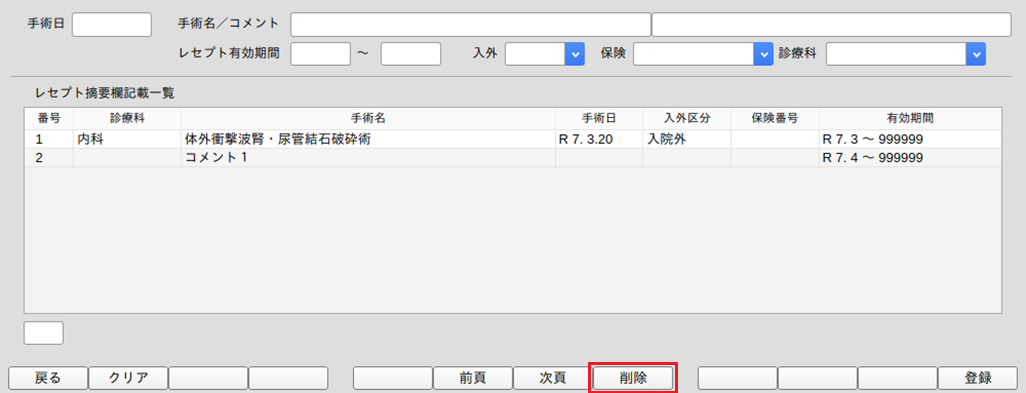 | 削除 | F8 | レセプト摘要欄記載一覧に登録済みの手術歴を削除します。 |