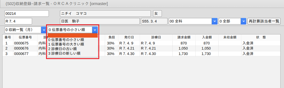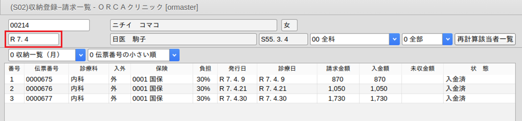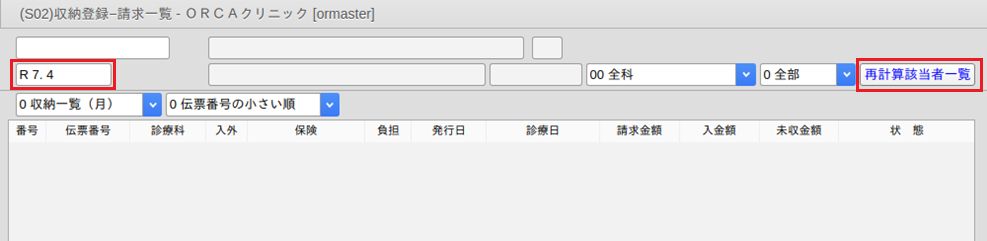 (S02)収納登録画面の診療月に該当患者がある場合は「再計算該当者一覧」を青字表示します。