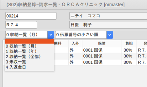 | 外来月別 | Shift+F1 | 月まとめの請求書兼領収書および診療費明細書を印刷します。 表示されている診療月,または選択中の収納データの診療月が対象です。 発行方法を「101システム管理マスタ」-「1039 収納機能情報」で設定できます。 |