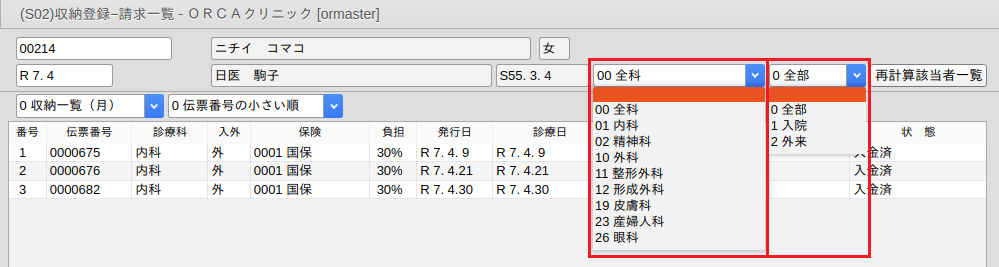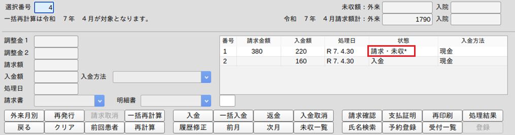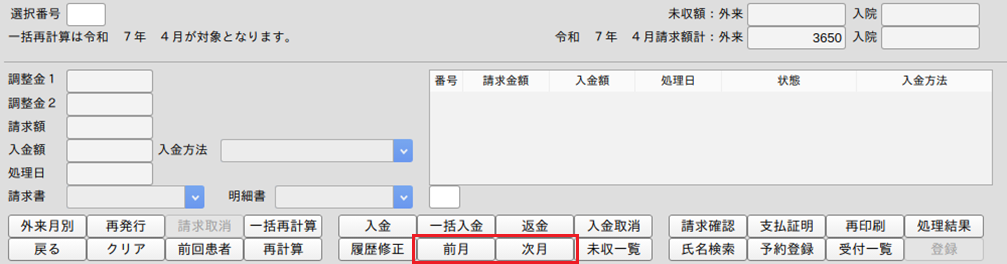 | 一括再計算 | Shift+F4 | 表示している月,または選択されている収納データの月を対象とし,その月のすべての外来収納データを再計算します。 |