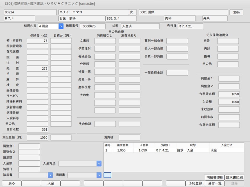診療行為を入力後,請求確認画面で過去診療分の返金を行なったデータです。