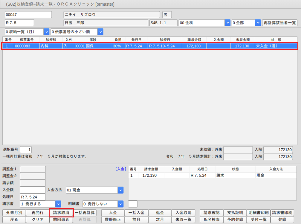 1.収納データを選択し,「請求取消」(Shift+F3)を押します。