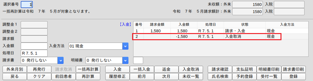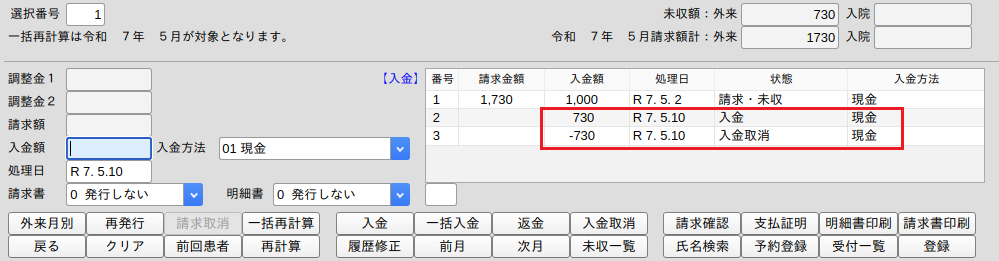 システム日付で全額を入金取り消します。日報が合わないおそれがあります。