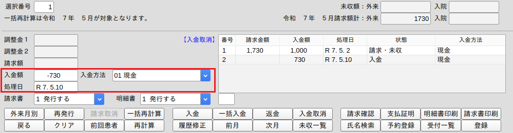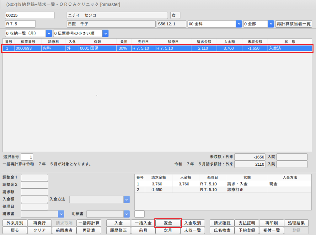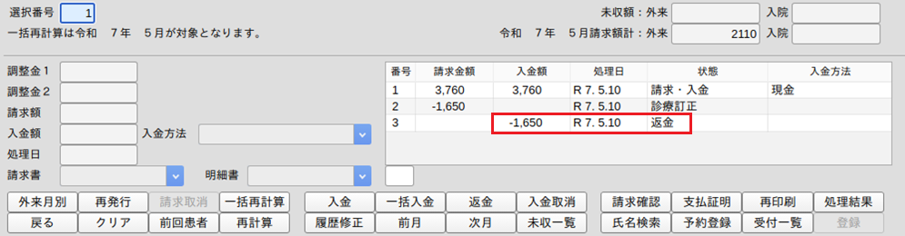 1.過入金(マイナス未収)の収納データを選択し,「返金」(Shift+F7)を押します。