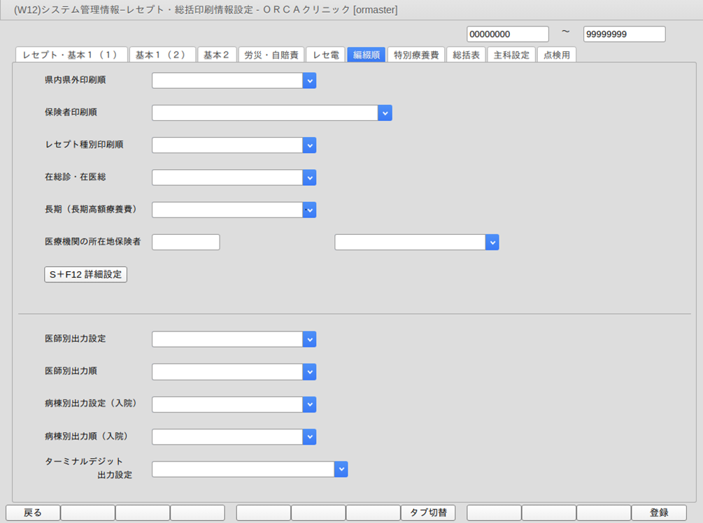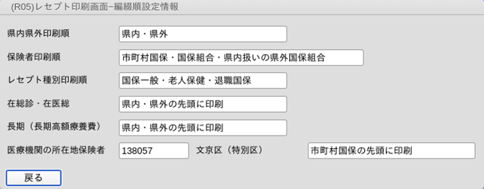| 在医総(任意) | 在宅時医学総合管理料または在宅末期医療総合診療料の算定患者についてレセプト印刷順を設定します。 「1 県内・県外の先頭に印刷」 「2 保険者の先頭に印刷」 |