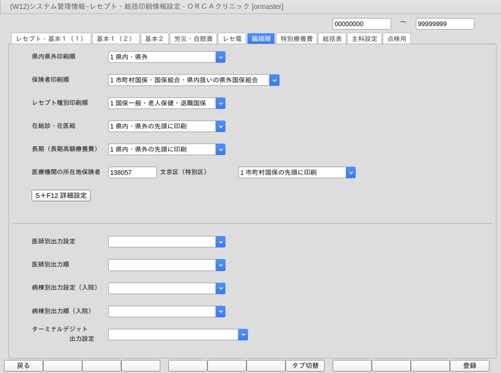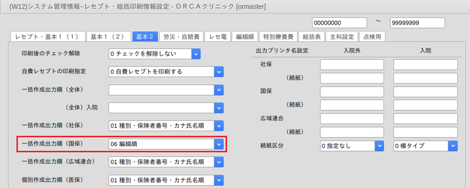 | 県内県外印刷順(必須) | 県内県外保険者のレセプト印刷順を指定します 県内分を先に印刷する場合は「1 県内・県外」を設定します。 「1 県内・県外」 「2 県外・県内」 |