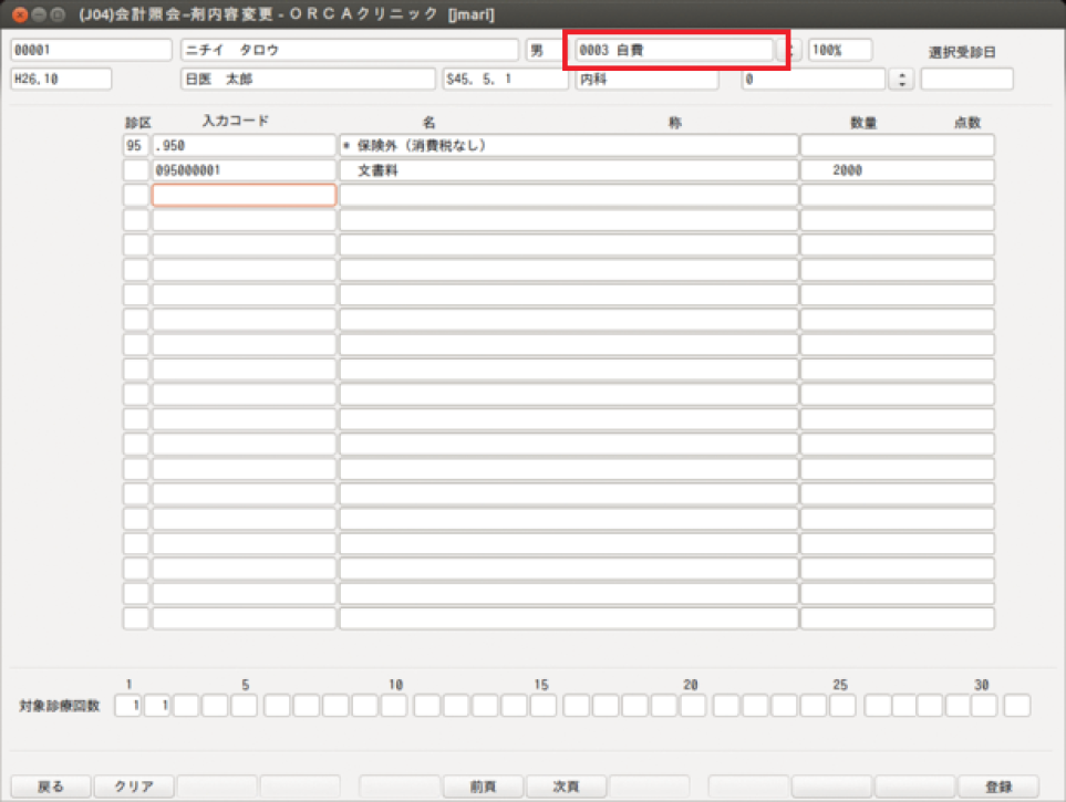 剤変更画面で保険組合せ,診療行為を入力し登録を行います(剤回数の入力はこの画面では行いません)。