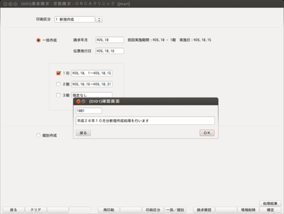 今回請求する期間を選択し,「確定」(F12)を押すと確認メッセージを表示します。